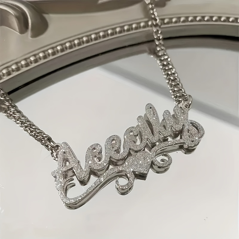 1pc Personalized Stainless Steel Name Necklace - Frosted Letter Pendant with Sparkling Accents, 18K Golden Plated Cuban Link Chain, Bohemian Chic Unisex Jewelry Gift for Women & Men, Casual or Special Occasions, Cursive Font