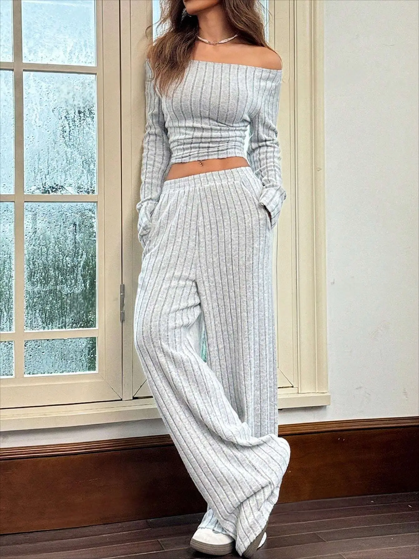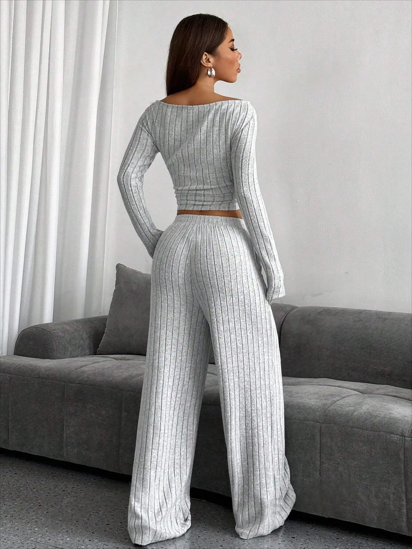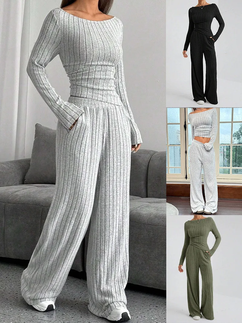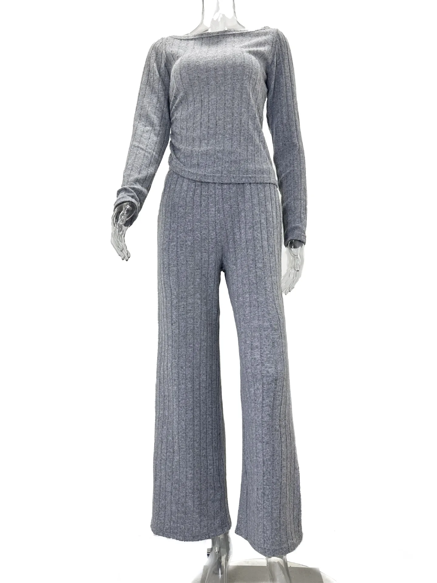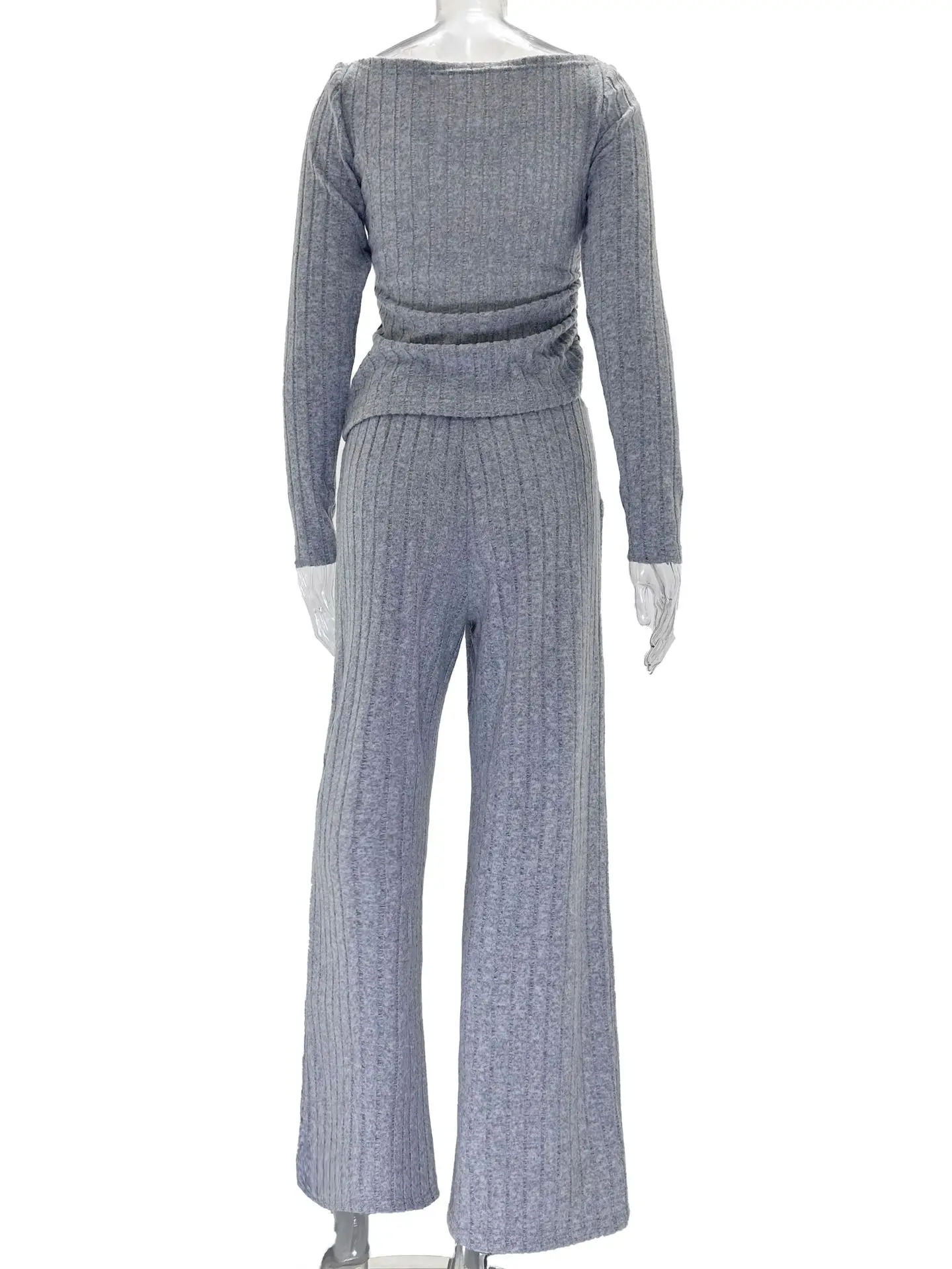 2024 Spring Knitted 2 Piece Sets Women Tracksuit Long Sleeve Vintage Sweater Crop Top Flare Pants Stretch Matching Suit Outfit