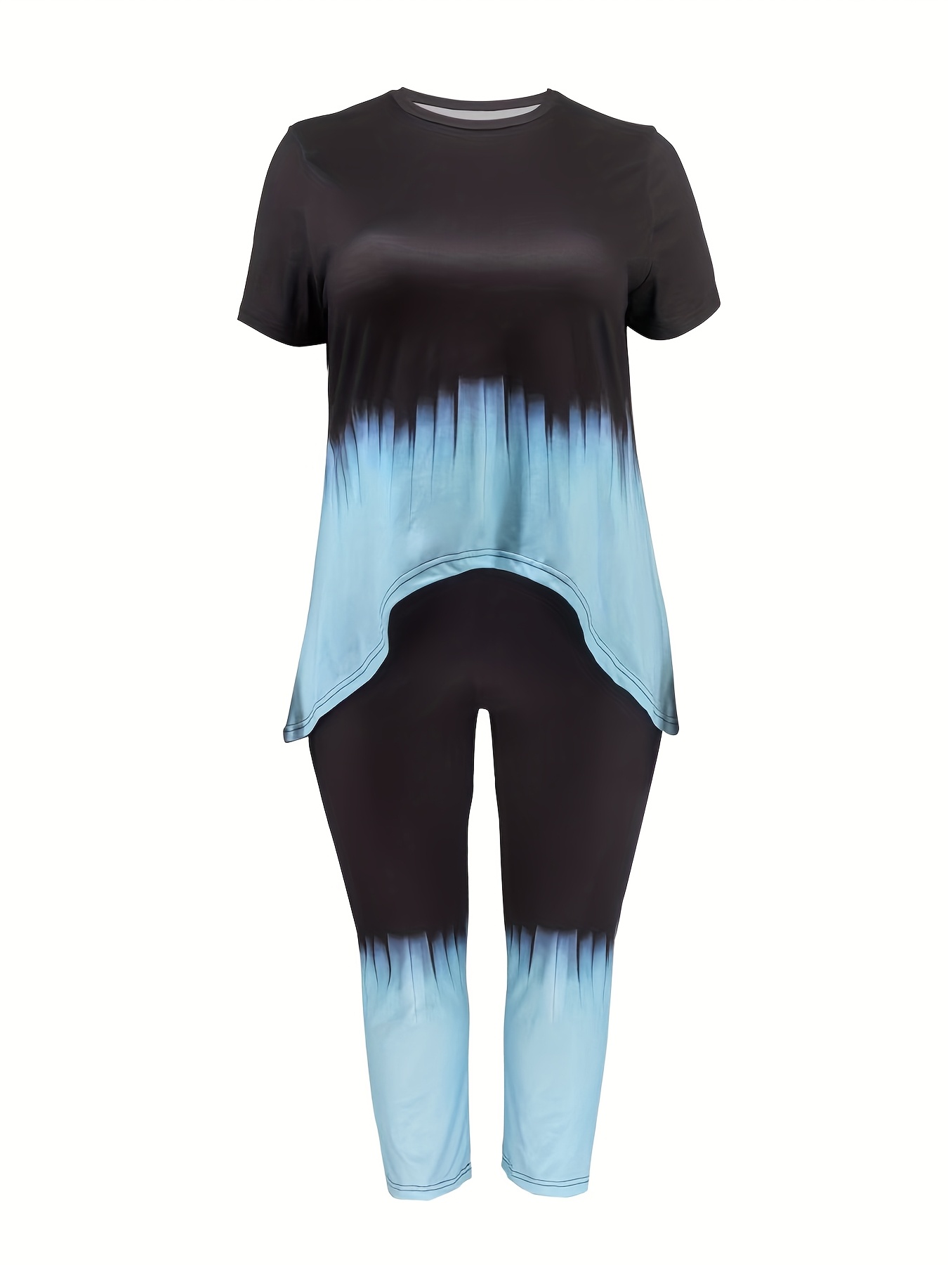 Plus Size Polyester Knit Tie-Dye Clothing Set - Short Sleeve Top And Long Pants - Machine Washable, Simple Style