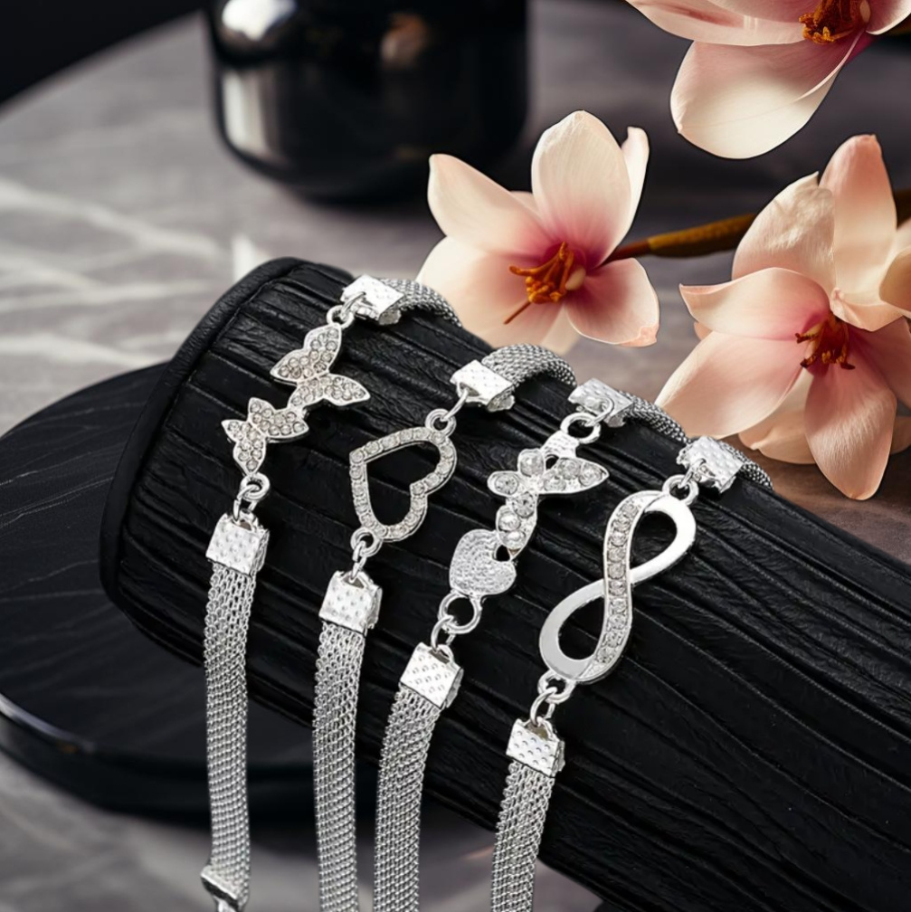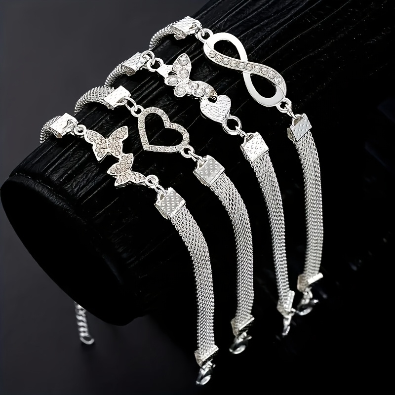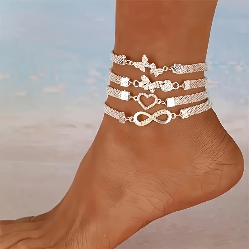 Set of 4- Elegant And Shiny Stackable Ankle Chains, Synthetic Zirconia Ankle Chains Plated with Butterflies And Hearts, Multifunctional Daily Jewelry Gifts