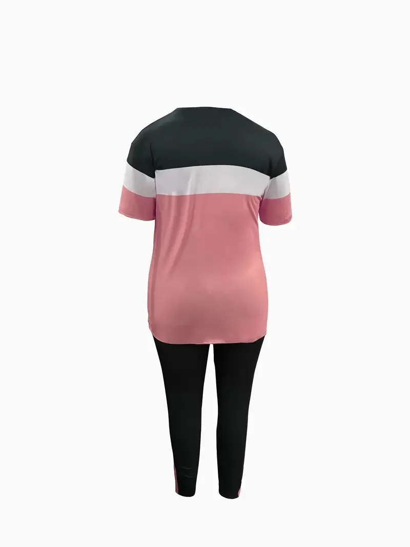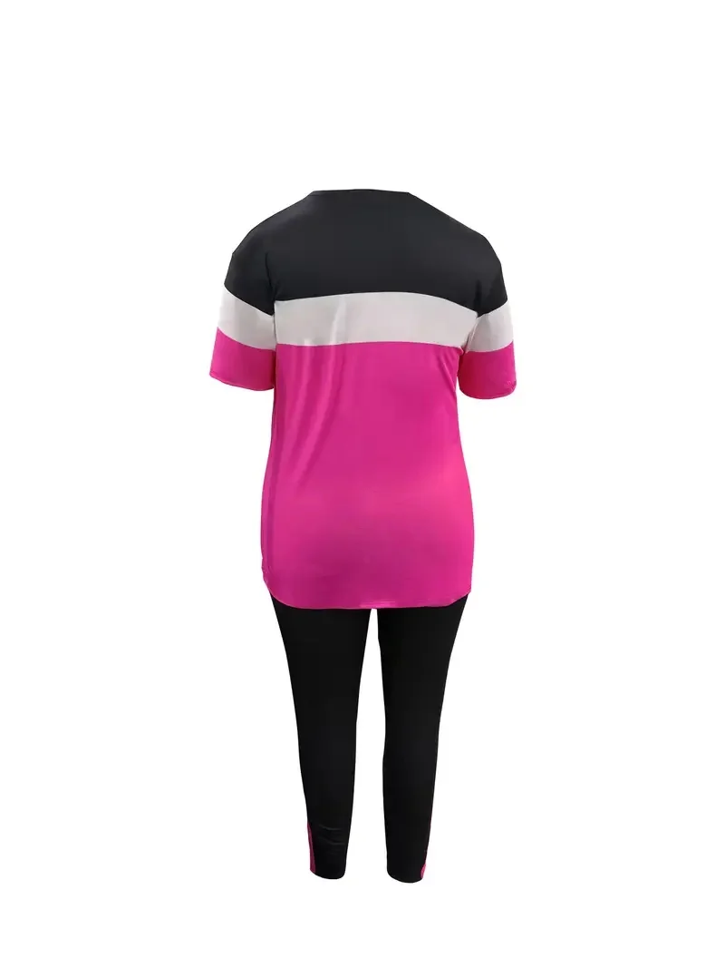 Plus-Size Women's Fashion Casual Short-Sleeve Long Pants Set with Striped Color