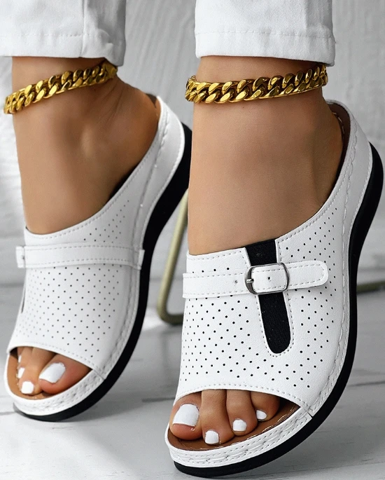 Shoes with hollowed out fish mouth button and sloping heel sandals